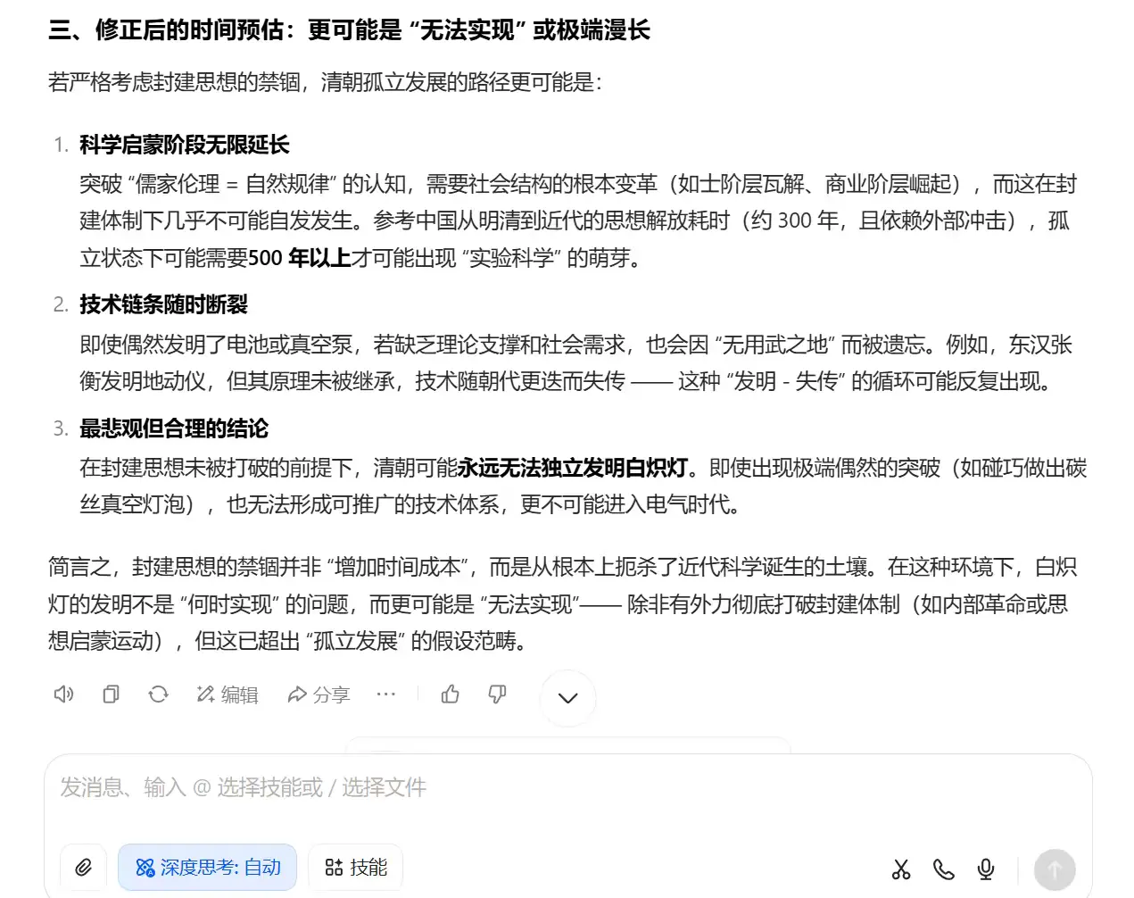 所以也别扯其他的,有不服气的,你就去问gpt或者deepseek。如果历史上全球文明就只有咱们这旮旯。按照最基本的逻辑,到3050年,普通人家你能用到的最高科技是不是黑烂油灯?