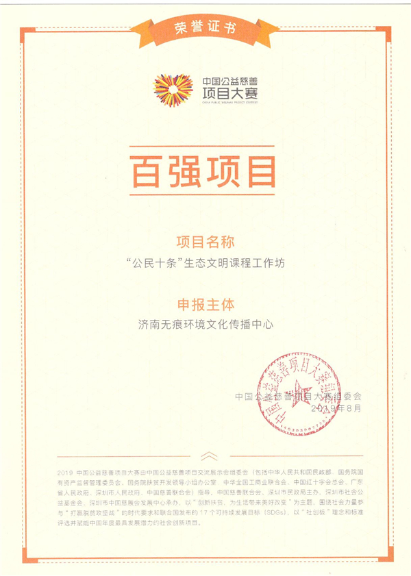 这是继“无痕环境公益课堂”项目荣获2017届大赛金奖以来,无痕中国的原创环境教育项目再次入围全国公益慈善百强奖。百强项目将获得大赛组委会颁发的荣誉证书,以及100万元的联合募捐配资。